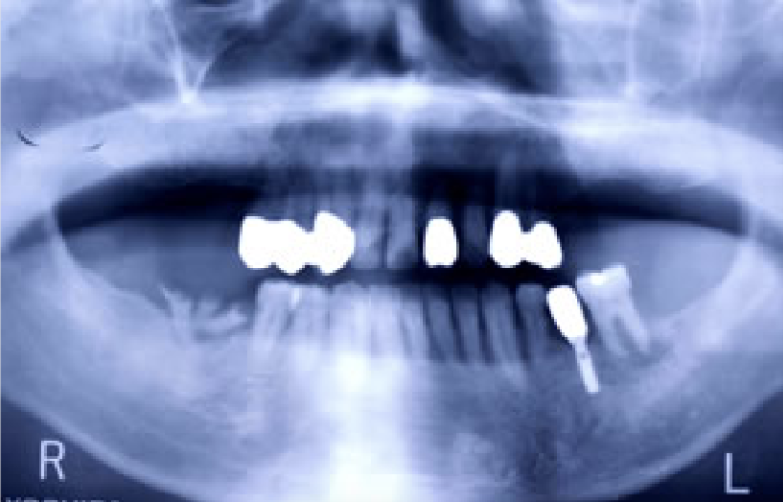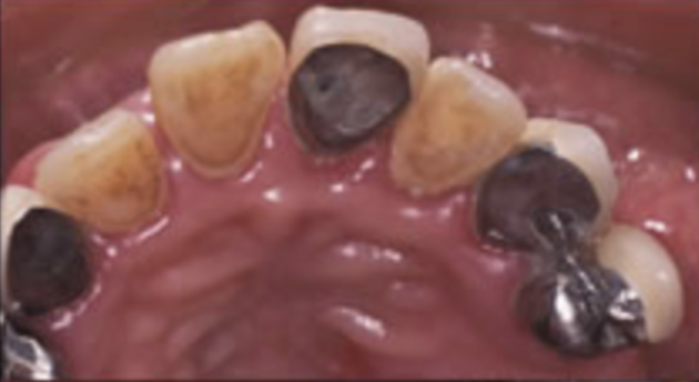抜歯後、歯周病処置、歯内療法処置、咬合高径改善、プロビジュナルレストレーションを経て最終補綴をおこないました。