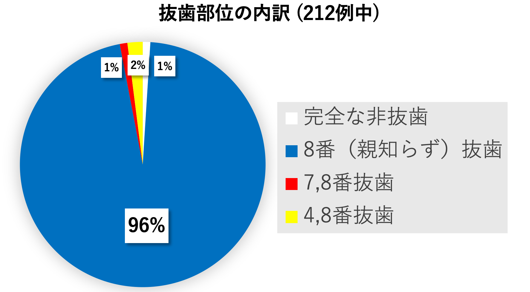 当院および長谷川信先生の200症例以上によるデータ(2025年1月)では、第3大臼歯(親知らず)の抜歯率は96%と歯の一括移動(“en block” movement)のためにほぼ抜歯しますが、小臼歯の抜歯率はわずか1%に留まりました。これは、従来の矯正治療と比較して歯を無駄に抜かずに治療を進められることを示しています。